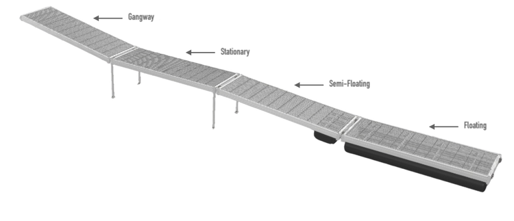Dam Docks floating dock kits include aluminum frames, deck panels and floats or posts to suit multiple configurations. Choose from Gangway, Stationary, Semi-floating or Floating kits to create your dream dock. Our dock systems feature: