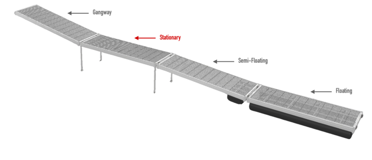 Dam Docks Stationary section kits include aluminum frames, drop-in Natural Cedar or Sunflow Composite deck panels and 50" post assemblies. All our dock systems feature: