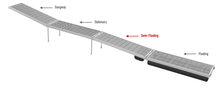 Semi-Floating sections are Gangways with end floats added-on. End floats are needed when connecting to a Floating section for extra stability. We have different add-on end floats to suit different lengths and widths of gangways. All our dock systems feature: